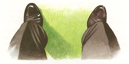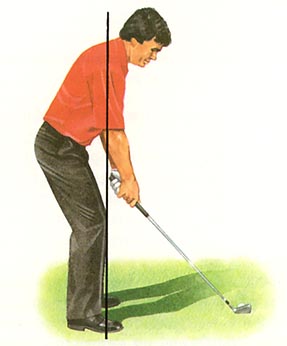 If a golfer bends too little at the hips, then the vertical line will pass behind the kneecaps to hit the ground in the region of the rear midfoot. The golfer will then be standing too erect, and there will be a sense that there is more weight on the heels relative to the balls of one's feet. Optimally, a golfer's weight should be evenly distributed between the heels of the feet and the balls of the feet, and he should be able to lift up the back of his heels slightly (or lift up his toes) without becoming unbalanced if his body weight is evenly distributed over the feet.