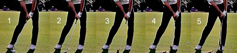 Adam Scott has placed his ball just behind low point, and he allows his releasing clubshaft and clubhead to catch up to his left arm by low point, and he does not deliberately attempt to sustain clubhead lag throughout his entire downswing so that he comes into impact with a large amount of forward shaft lean secondary to an intentional attempt to prevent the complete release of PA#2.