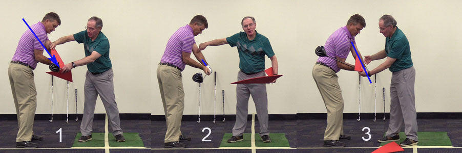 early-mid downswing. Note that I am holding a red cardboard wedge against the