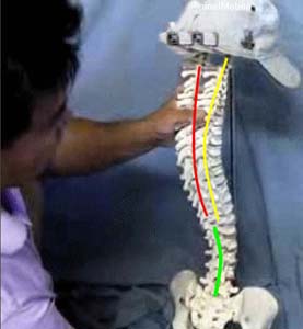 I have kept the colors the same, so it should be apparent where the thoracic spine and lumbar spine are roughly situated. I believe that the thoracic spine's arch-curvacture to the left (relative to the lumbar spine) is responsible for the S&T swing's left-leaning look - the "Leaning Tower of Pisa" look, where the upper torso appears to be leaning leftwards relative to the lower torso, even while the mid-upper thoracic spine appears to be vertical when viewed from a face-on view.