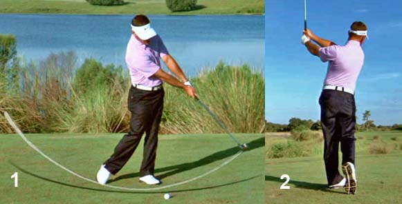 In his CP-release action swing, his clubhead arc path is slightly out-to-in through impact, and Dan refers to this phenomenon as "shifting the baseline left". A golfer can use this type of "out-to-in" clubhead path to deliberately hit a pull-fade shot.In his CF-release action swing, his clubhead arc path is slightly in-to-out through impact, and Dan refers to this phenomenon as "shifting the baseline right". A golfer can use this type of "in-to-out" clubhead path to deliberately hit a push-draw shot.