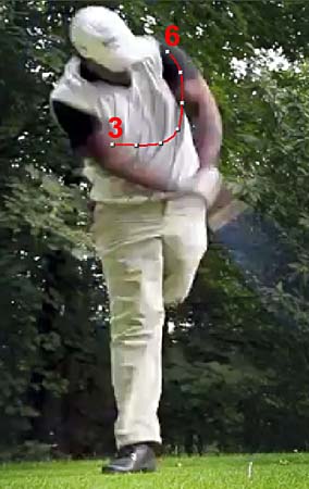 Image 3 shows Rory McIlroy at the P5 position. Note that his pelvis has not dropped down more (compared to its P4 position), but his head had dropped down more due to increased flexion at the level of his hip joints and due to his loss of the arch-extension manuever (left thoracic spine extension maneuver).