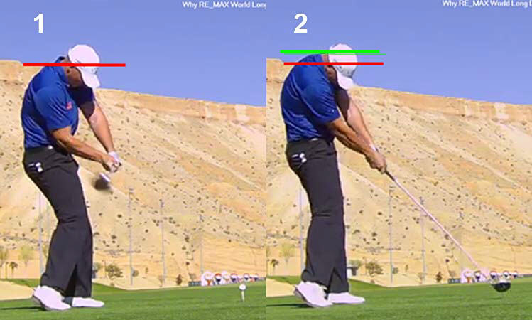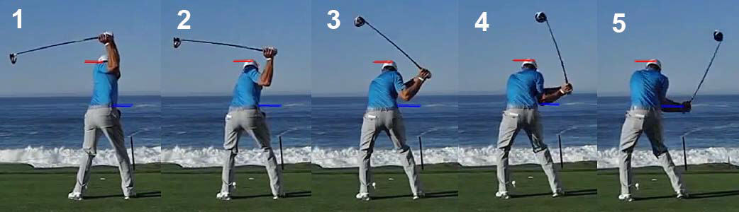 Image 1 shows Rory McIlroy at address. I have drawn a blue line at the top of his head, and two red lines at the level of his pelvic crest.Image 2 shows Rory McIlroy at his end-backswing position - note that his pelvis has dropped down (groundwards) due to increased bilateral knee flexion. Note that it causes his head to drop by roughly the same amount.