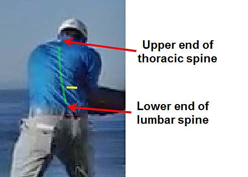 Note that there is white mark on his shirt just below the center of the back of his shirt collar, which indicates the likely position of the upper end of his thoracic spine. The lower end of his lumbar spine is located just above his natal cleft ("butt crack"), which is a point midway between the two belt loops on the central-back portion of his trousers. I have drawn a curved green line to delineate the likely positional alignment of his thoracic-lumbar spine, and a horizontal yellow line to delineate the top of his lumbar spine. Note that he only has a minimal amount of right lateral bend at this time point of his downswing. Also, note that he doesn't increase the natural degree of lordosis of his lumbar spine (when measured in the sagittal plane) between P4 and P5.5.