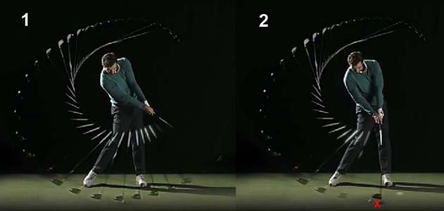 Image 1 - I have drawn green lines alongside the outer border of Rory McIlroy's pelvis and upper thighs at his end-backswing position. Note that his pelvis is not perfectly centered and it is closer to his right foot, which means that he is using a right-centered pelvic motion loading technique during his backswing action.Image 2 shows Rory McIlroy at the P5 position. Note that he has shifted his pelvis targetwards to a small degree, so that his pelvis becomes roughly centered between his feet by the end of his early downswing.