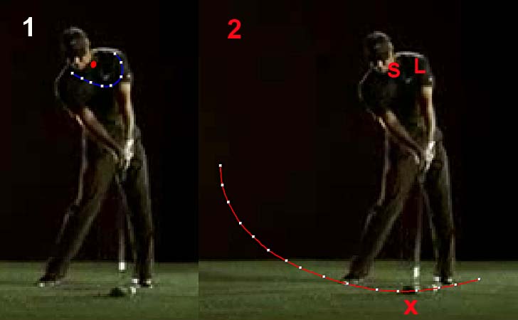 Image 1 shows the SPI golfer at his end-backswing position. I have drawn red lines alongside the outer border of his pelvis/upper thighs. Note that his pelvis is not perfectly centered between his feet and it is closer to his right foot, which means that he is using a right-centered pelvic motion loading technique during his backswing action.Image 2 shows the SPI golfer at the P5 position. Note how much he has shifted his pelvis targetwards during his early downswing action in order to center his pelvis by the end of his early downswing. It may "look" like he is not bumping his pelvis targetwards because he manifests an exaggerated left femur abduction/external rotation maneuver that causes his left femur to be slanted away from the target.