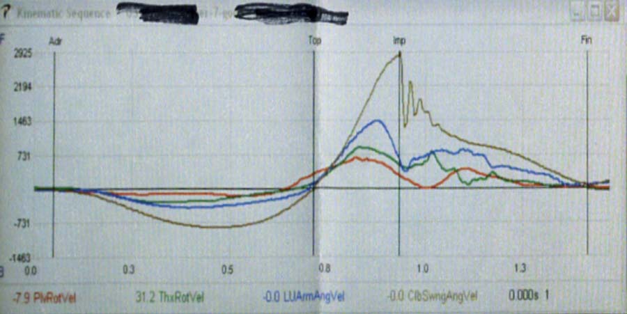 I have traced his hand arc path in blue, and it looks similar to his hand arc path when driving while standing. However, he can only drive the ball about 250 yards when sitting-on-his-knees - compared to 330 yards when standing. That represents a loss of about 25% of his potential driving distance (which is about "average" when I looked at a number of videos of other professional golfers who drive from a "sitting-on-one's-knees" position), and many golfers may consider that 25% loss as being due to a loss of the "leg power" contribution to swing power. However, I think that it really represents a loss of pelvic rotary motion power - because it is very difficult to rotate the pelvis very efficiently and very fast when driving from a sitting-on-one's-knees position. Standing up in the standard address posture (with the knees slightly flexed and biomechanically "lively") allows the pelvis to rotate much more efficiently and much faster during the downswing's P4=>P6 time period, and I consider the 25% loss of carry distance as being representative of a loss of pelvic motion power (and not a loss of leg power). In other words, although I do not believe that the legs actually power the golf swing, they can certainly enable the pelvis to shift-rotate in a maximally efficient manner.The SPI presenter defines separation as being the "amount of time between each stage in the downswing", and he claims that Rory McIlroy starts his downswing with stage 2 and that he then fires all the remaining stages simultaneously with no visible separation between stages 3, 4 or 5. He, unfortunately, didn't elaborate on this topic, so I have no idea what he means when he asserts that Rory McIlroy fires stages 3, 4 and 5 at the same time. I therefore regard his personal opinions regarding the topic of Rory McIlroy's separation as being meaningless gobbledegook!