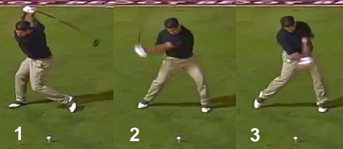 Kelvin Miyahira has drawn a concave-curved red line along the left lateral border of Tiger Woods' mid-torso, and he is seemingly implying that it indicates the "fact" that Tiger Woods is manifesting a significant degree of lumbar lordosis. However, this implied assertion is obviously wrong because any concave-appearance of the lateral border of Tiger Woods' left mid-torso is merely reflective of the fact that Tiger Woods has rotated his upper torso more than his pelvis during his backswing's pivot action, and the concave-appearance of the lateral border of his left mid-torso is reflective of the degree of torso-pelvis separation (static X factor) that Tiger Woods has acquired during his backswing's pivot action. One cannot see Tiger Woods' lumbar spine in that face-on image, and there is no evidence that Tiger Woods increases his natural degree of lumbar lordosis (which should always be measured in the sagittal plane) during his late backswing or early downswing.Here are back-view images of Tiger Woods' early-mid downswing action.